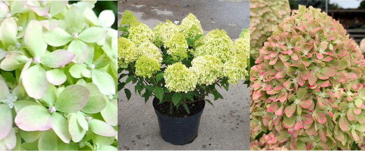 Окраска соцветий: соцветия раскрываются бело-лаймовыми цветами, со временем становятся нежно-розовыми. Могут приобретать легкие фиолетовые и даже голубоватые оттенки.