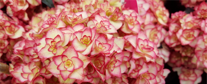 Окраска соцветий: центр цветка матово-белый с нежным розовым оттенком. По краям его обрамляет яркий розовый, создавая кружевной эффект.