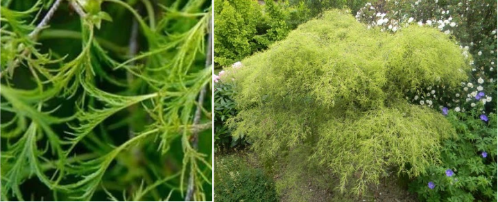 Весной и летом листва окрашена в яркий зелёный цвет, а осенью приобретает золотисто-жёлтый оттенок, превращая дерево в яркий акцент сада. Крона округлая или раскидистая, густая, с элегантно свисающими ветвями, которые придают растению грациозный вид.