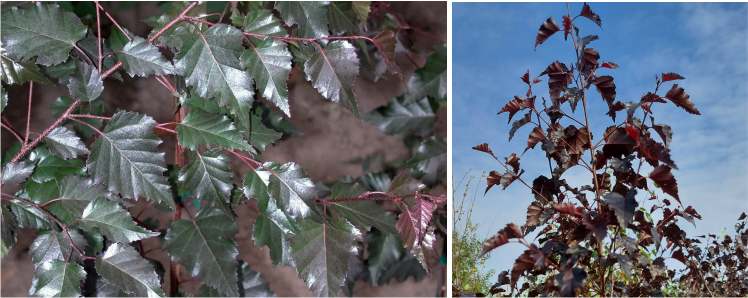 Листва тёмно-фиолетовая, как у березы сорта "Пурпуреа", но благодаря оттенку коры "Роял Фрост" выглядит более насыщенно и ярко. Зимой тёмная кора особенно выигрышно смотрится на фоне белого снега.